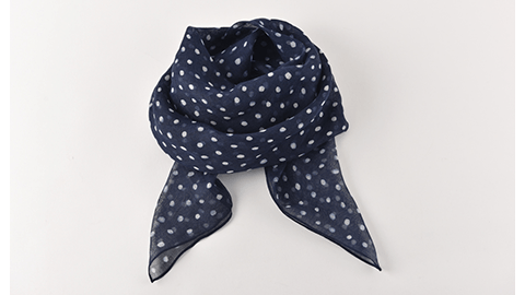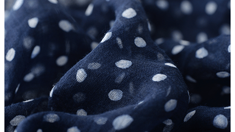 クラシックだけれど、あたらしい。そよそよ吹く風に、ふわりと舞いあがるくらいのかるさ。そして、光をきれいにとおす、透け感。うんと薄い麻の織物をつかって織りました。水彩で、1点ずつ手描きした「みずたま」をもとにしたプリントも、じつはとても高度なわざ。水彩ならではの滲(にじ)みや濃淡をいかすため、手捺染という、シルクスクリーンのような技法で、みずたま部分だけで2版を使ってプリントし、さらに紺地を1版重ねています。ちなみに「リュシオル」は、フランス語で「蛍」の意味。