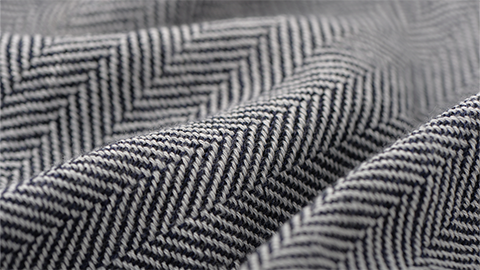 よこ糸は、同色のグレーの糸を3本縒りにして、V字型の、連続する糸杉模様であるヘリンボーンのはっきりした柄をだしました。
