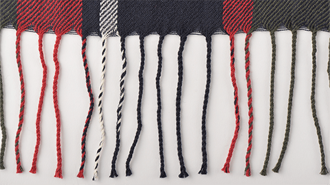 - くびまきの短辺の左右の端は、巻いて縫うことをせずに、からみ織りという織りでほどけないように留めています。