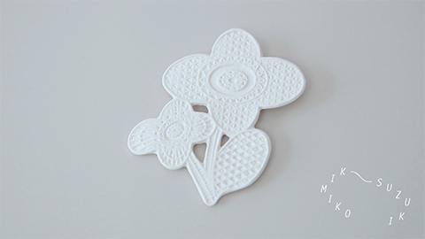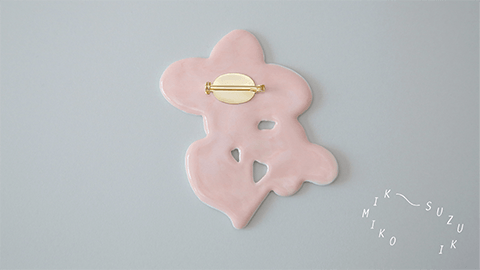 陶芸の量産技術である型と手仕事を組み合わせたシリーズ。無釉でマットな質感が特長です。裏面に釉薬をかけることで強度を増しています。ふたつの花が寄り添っているデザインで、秋冬の厚手のニットやアウターにつけても似合うよう、大きめにつくっています。裏面は限定色のピンクです。