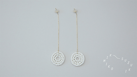 ペースト状にした磁土でレース模様を一点一点描いて焼き締めた一点もののシリーズです。強度を保つため、3~5回層にして高温焼成しています。金属部分は上品な光沢のK10YGを使用しています。装着時、チェーンの長さを調節できるのもポイントです。