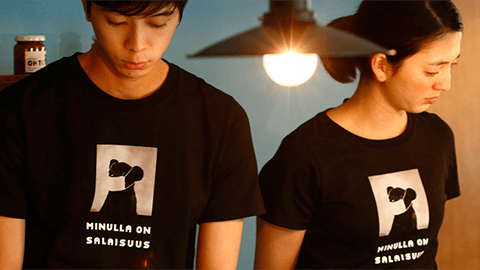 真っ黒いボディに、マスクをしたくまの肖像写真。その下には、フィンランド語で「わたしには、ひみつがあります」のメッセージ。まるで、くまの秘密結社の一員になったみたい?いわくありげなムードがたのしいTシャツです。くまの毛並みまで再現した、リアルなプリントが特徴です。