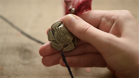 メダルのようなこのアイテムは、編み糸用のカッターです。詳しい説明はこちら。