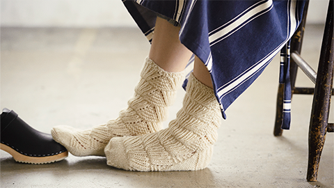 Miknitsではじめての販売となる、「くつした」が編めるキットです。扇のような形がつづく、この柄を「ベアトラック(くまの足あと)」と言います。詳しい説明はこちら。