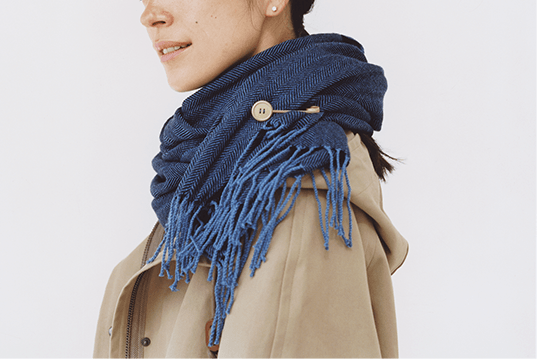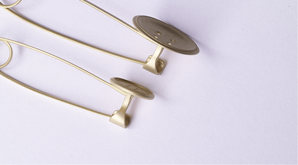 今回のテーマは、ボタン。大小2種類のシンプルなボタンが、大きな安全ピン型の留め具についています。