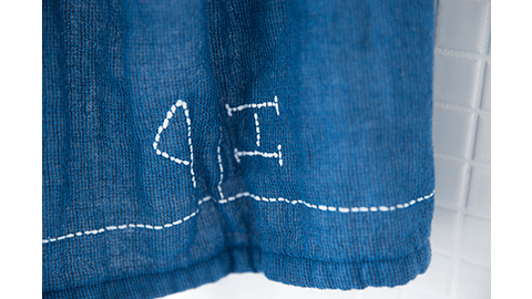 立体感のある刺し子のような点線は「白顔」(はくがん)という技法でのプリント。「手染めの綿や、洗った藍染めのような印象にしたい」というディレクションをもとに、通常の平織りではなく2色に先染めした糸を縦横に1本おきに配置することで、独特な織り柄がうまれました。