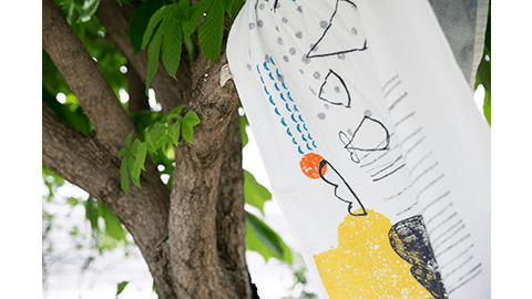 抽象的な絵画のようですが、横位置にすると、具体的にあるものが描かれているのがわかります。それは、日本の四季。春夏秋冬がうつろうさまを、雲、山、雨、太陽などをモチーフに、まるで「屏風絵」のように描かれているんです。タオルを「巻く」と、その四季が、おわりなく、つづいていく。