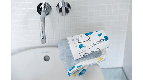 - 片面ガーゼ、片面パイルの二重織りのため、両面パイルのタオルの「厚さ」や「重さ」とは質感が異なります。