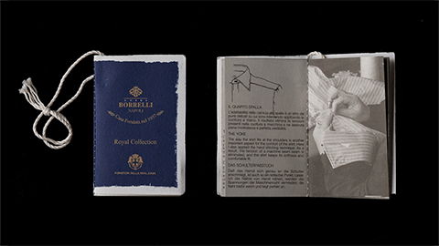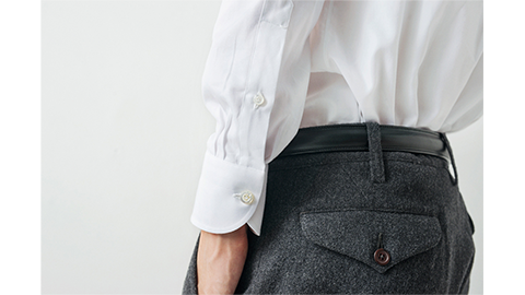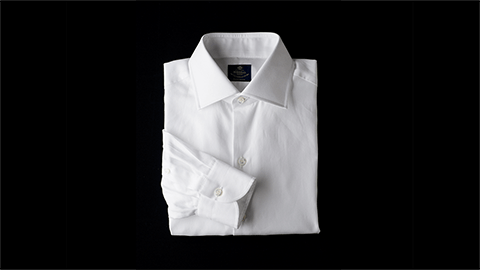“ワイドカラー”は、ボレッリ社では“ルチアーノ(Luciano)”という名前で知られている、定番のひとつ。ネクタイを締めたときに、とてもきれいに決まり、日本市場でもたいへん人気が高いかたちの襟なんです。このワイドカラーシャツの素材には、「ヘリンボーン」(杉綾)をえらびました。それも、目を凝らさないとわからないほどのこまかな織り。海島綿とスーピマ綿の交配種であるマスターシードコットンの糸を細くつむぎ、やわらかく織っていますから、とてもソフトな感触。ヘリンボーンならではの光沢も出ています。ちなみに生地をつくる工程は、日本国内でおこなっています。それをイタリアに送り、ボレッリ社が縫製。かたちは、まったくのイタリア仕様ではなく、メンズのシャツはフィット感が大切であると、日本人の体型に合うスタイルを採用しています。