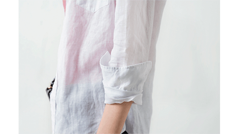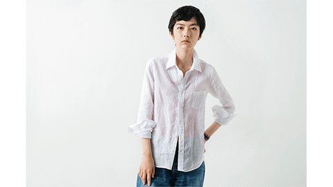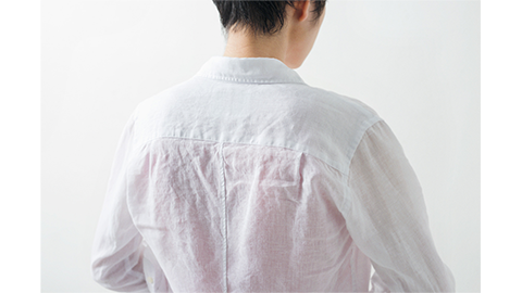 リネンのシンプルなシャツのいいところは、洗って、そのまま伸ばさずに乾かせば、アイロンをまったくかけずに着ていただけること。「らくちん」で「おしゃれ」です。もちろんこのシャツも「くしゅくしゅっ」と着て、様になる。カジュアルなのに、ふわっと香りたつような品があります。しかも、後ろのラインのウエストがきれいにシェイプされたパターンなので、「飾らないのに、女性らしい」印象が出ます。前ボタンをすべてとめてもいいですし、ひとつ、あるいはふたつ開けてもかっこいい。襟を立てて着るのもいいでしょうし、透け感をいかして、重ね着として、前ボタンをすべて開けて羽織るように着ても、いいですよね。