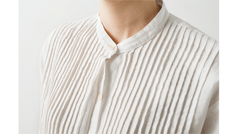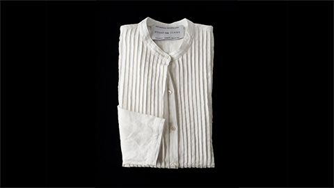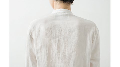 髙品質なリネンの織り地、スタンドカラーの襟、前身ごろにこまかなピンタック、裾にはゆったりしたドレープ。着ると、腰のあたりに自然な「くびれ」がうまれる。まるでヨーロッパの(それも、フランスやイタリアの)アンティークのような雰囲気をもったドレスシャツです。今回のラインナップのなかで、とりわけ個性的で、女性らしい1枚かもしれません。最初、触ると、すこしだけ硬さを感じるかもしれませんが、着て、洗って、乾かして、それをくりかえしていくうちに、どんどんしなやかになっていきます。