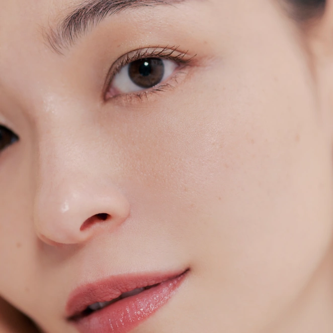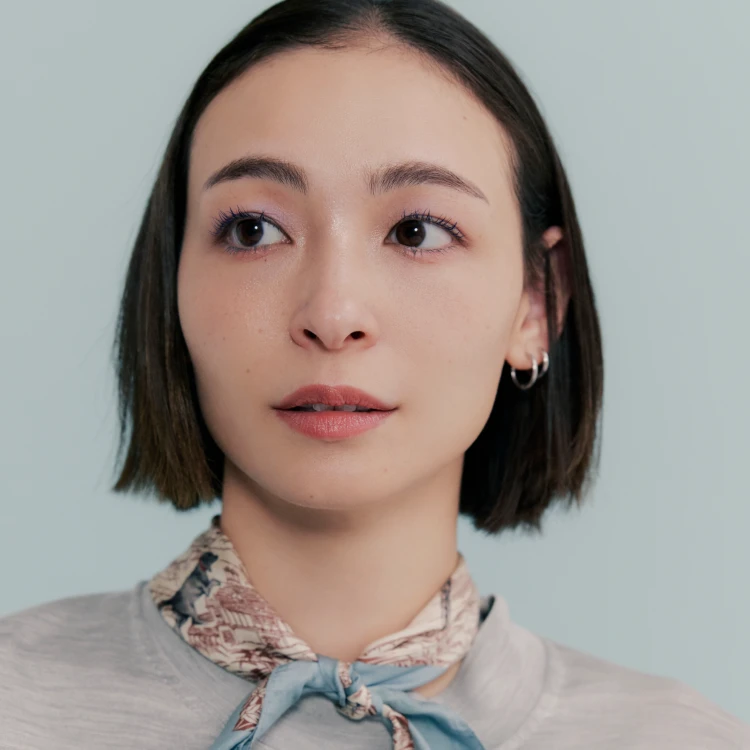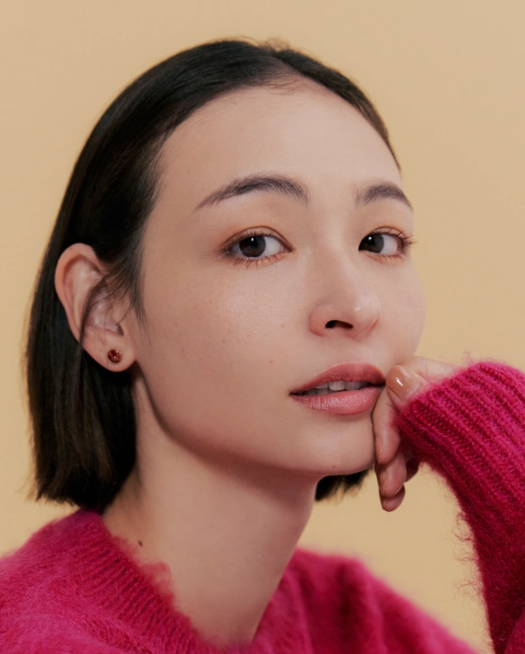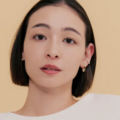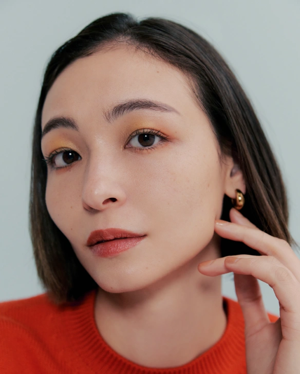 上のまつ毛には柿色(パーシモン)、 下まつ毛には鮮やかな赤のマスカラを使ったメイク。 アイシャドウには、肌なじみのいい ベージュ系のカラーをのせて、 目元全体をまろやかに仕上げました。 下まぶたの中央だけに入ったゴールドが さりげない光を放ちます。