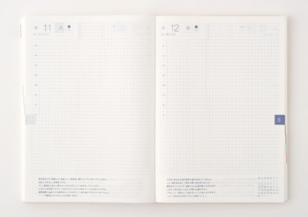 The weekly diary is a special section only available in the Cousin edition, and contains one week per two-page spread, with timetables from 6:00 to 24:00. This section is useful for tracking the progress of certain projects, making plans for a trip, recording health conditions for tracking purposes and keeping track of expenses; the possibilities are endless.