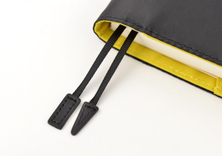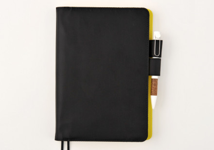 A tab is sewn onto each side of the cover in order to hold a pen and keep the cover closed. Because of its shape, the pen holder is called a "butterfly clasp" in Japanese.