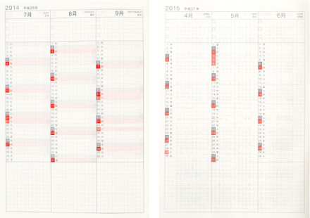 In order to make the pages easier to write on and to read, the design this year has been toned down with features such as thinner borders around the monthly calendars and all background color removed from the yearly index pages.