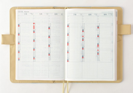 6ヵ月を見開きで一覧できる長期的な予定管理のページを 2016年4月から2017年3月までの1年分収録しています。 ページの上部に、目標ややるべきことを書いておける チェックボックスを3つ設けました。 下部には、自由に書き込めるスペースを設けています。
