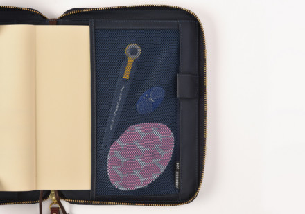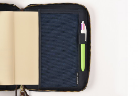 厚みのあるものや、かさばる形状のものの収納に便利な メッシュ生地のポケットです。 ペンケースとして使うこともできます。