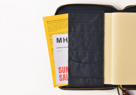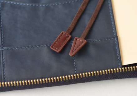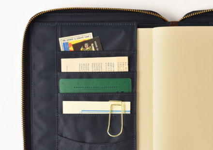 カバーの外側と内側の生地の間に いちばん大きなポケットがあります。 A4サイズの書類を折り曲げるかたちで収納できます。