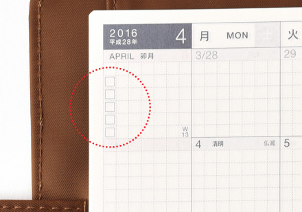 その月の目標や、するべきことを書いておけるよう、 5つのチェックボックスを設けています。 方眼を利用して、ボックスを増やすこともできます。
