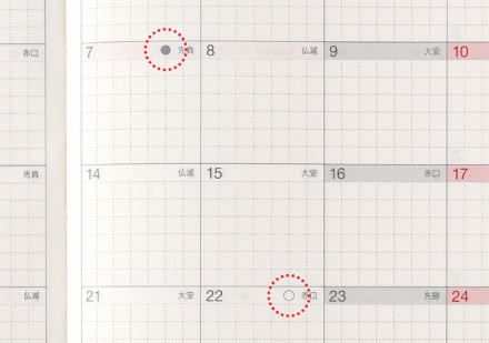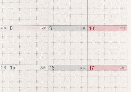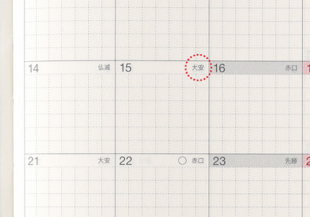 「大安」「仏滅」といった六曜を表記しています。 大事な行事の日取りを決める際にお役立てください。