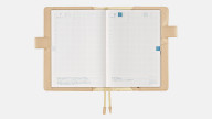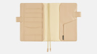 The beige faux-leather interior and pen holdercomplete the cover’s elegant look.