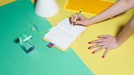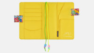 The cover interior is a bright yellow, and the bookmarks are a neon yellow and neongreen. The bookmark charms contain a circle and a square to evoke the feel of Masuda’s work.