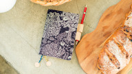 The bookmarks of this cover use original mina perhonen lace straps. If you see any loose threads, we recommend refraining from pulling on it and instead tucking it between other woven threads.