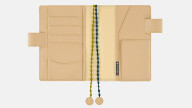 The pen holder is designed to perfectly fit the 12.2mm (0.48”) diameter Jetstream pen offered as a free bonus gift with select Japanese-version Hobonichi Web Shop products. Pens with certain shapes and materials may be difficult to pull through the holder. The holder can fit pens up to 13.5mm (0.53”) in diameter.