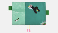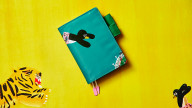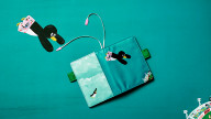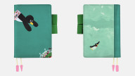 Fly in the Sky is available in an A6 size for the Planner and Original books. It depicts a scene in the book when the main character, a penguin, flies through the sky. A baseball stadium is visible in the background. The flying penguin is also printed onto the deep, sky blue interior pocket. The pen holders are a deep green, and the bookmarks are white with pink charms on the ends. This is a cute cover befitting the cute children’s book that inspired it.
