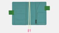 The pen holder is designed to perfectly fit the 12.2mm (0.48”) diameter Jetstream pen offered as a free bonus gift with select Japanese-version Hobonichi Web Shop products. Pens with certain shapes and materials may be difficult to pull through the holder. The holder can fit pens up to 13.5mm (0.53”) in diameter.