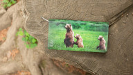 In the photograph, the mother and her cubs stand on their hind legs, looking carefully at something in the distance. It’s a very charming scene, seeing the cub chewing on grass gently resting his hands against his mother’s back.