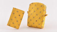 This case and pouch both feature a happy Mr. Saturn walking alongside other Mr. Saturns facing various directions, some wearing a red handkerchief to cloak themselves like a ninja.