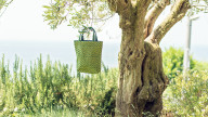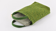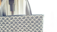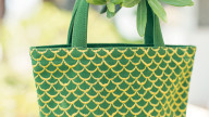 The mermaid tote bag is made with an embroidered textile that resembles fish scales or sea waves. It comes in green or gray to match the mermaid techo covers.