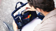 Woman carrying the case on her side. Easy access to the outer pockets.