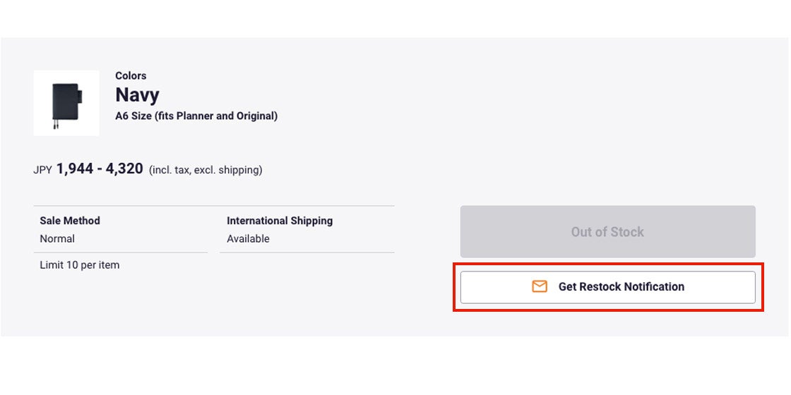 *This service is only available for the Hobonichi Techo. Restock notification emails are not available for accessories.