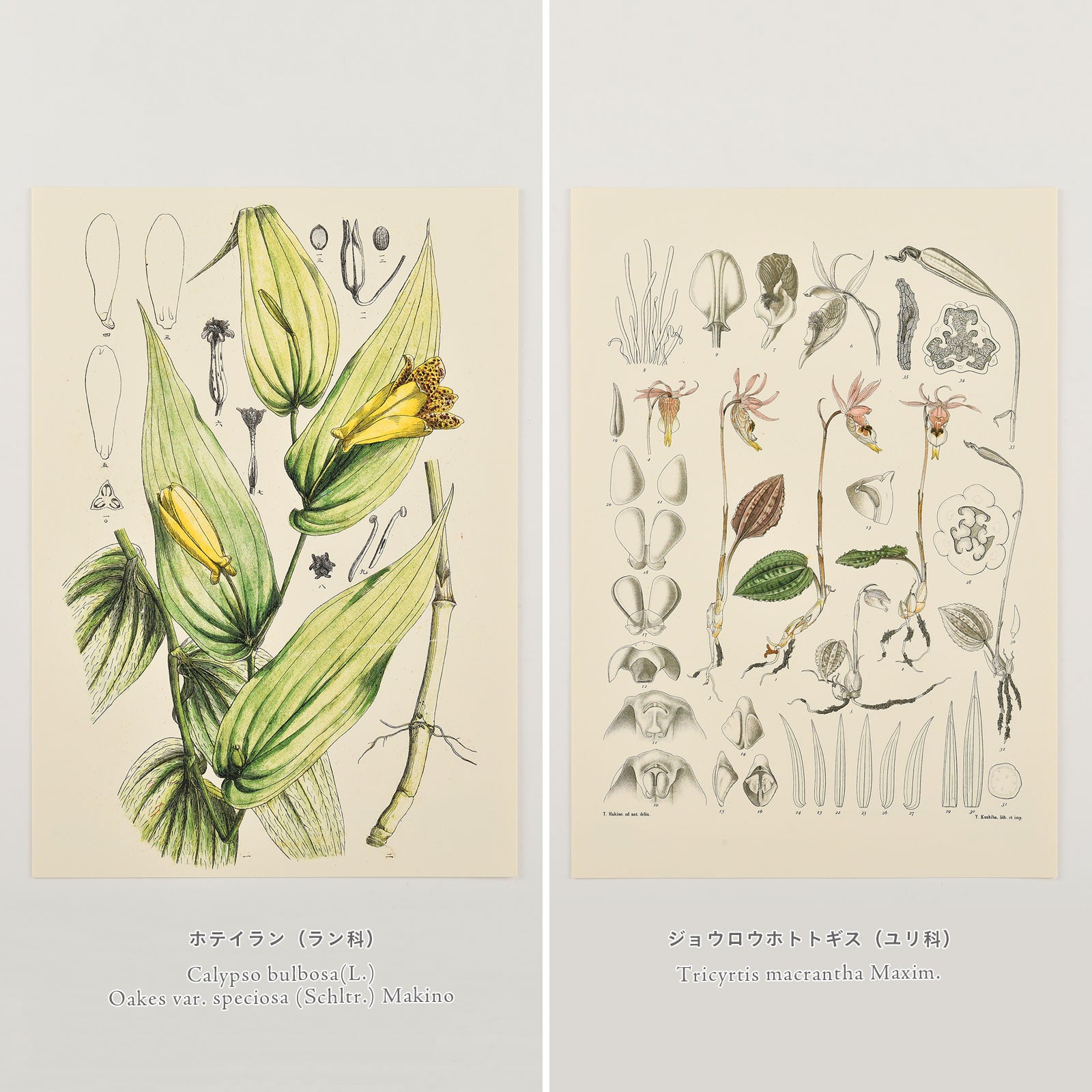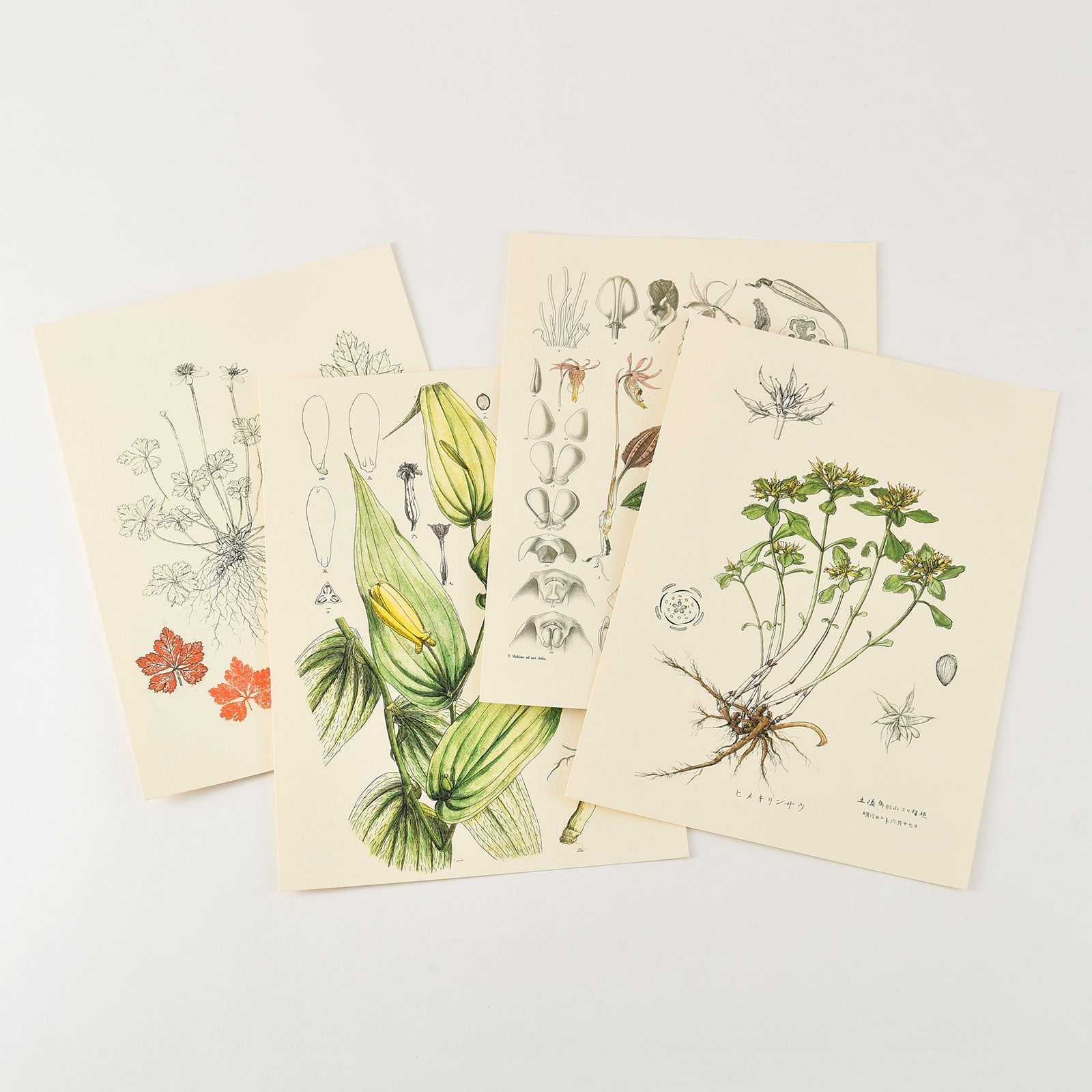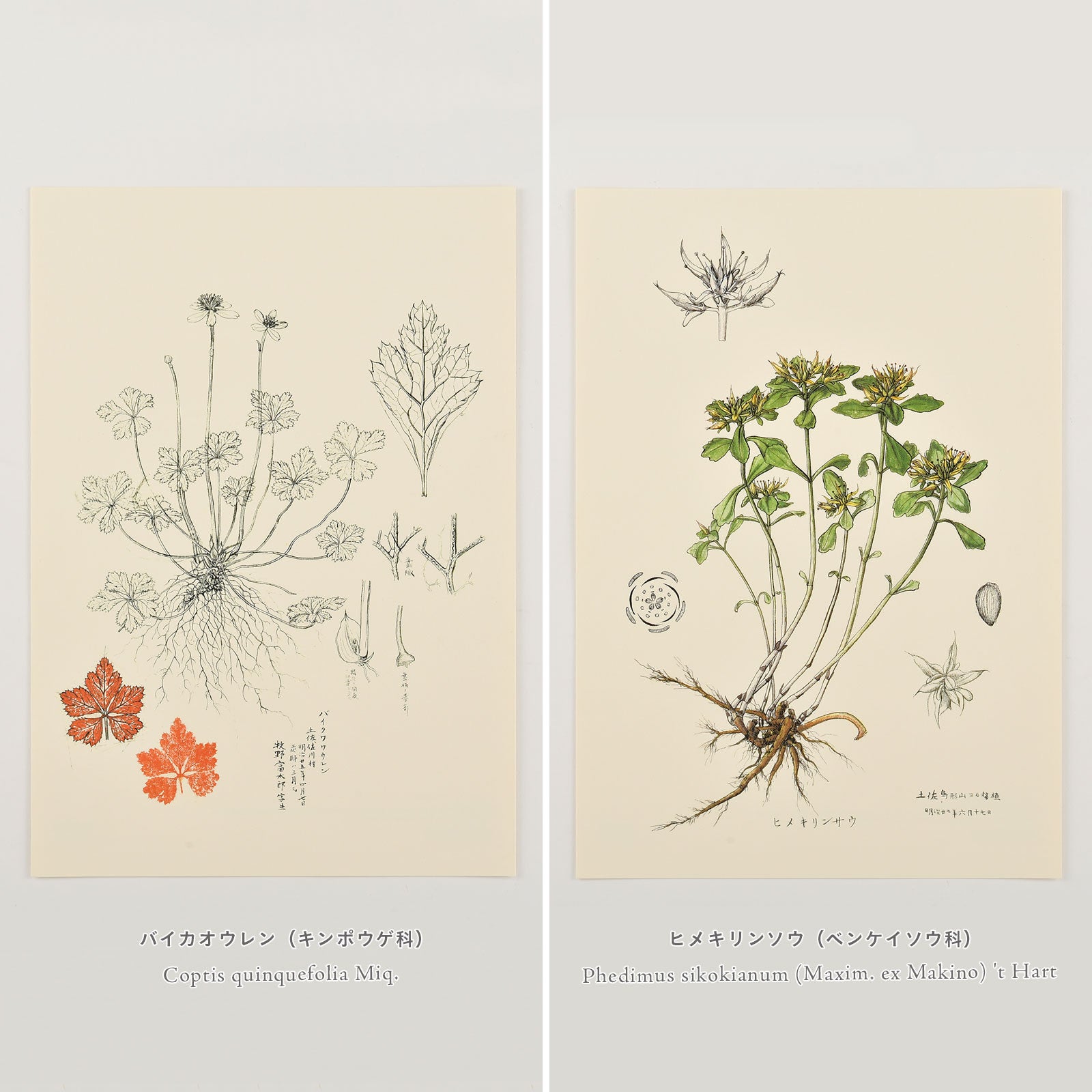These plant illustrations were drawn by botanist Tomitaro Makino, known as the “Father of Japanese Botany”. We printed illustrations of plants that have a close relationship with Dr. Makino, in that he preferred, discovered, or gave the Japanese name of the plant. They are: Calypso bulbosa, Tricyrtis macrantha Maxim, Coptis quinquefolia Miq, and Phedimus sikokianum. Each diagram is drawn out with intense detail through careful observation.