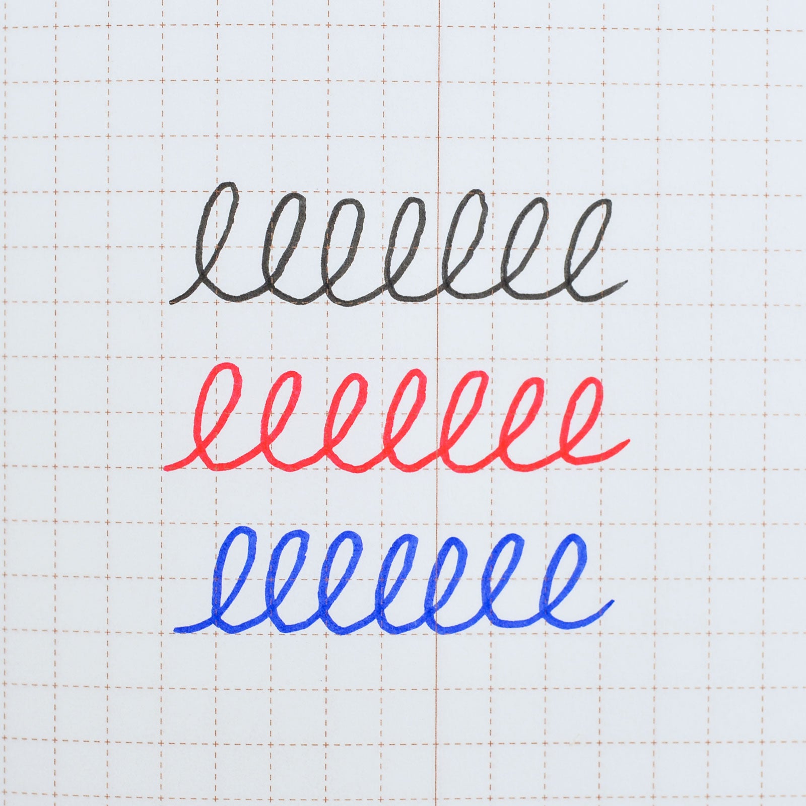 Taking a closer look at the nib will reveal that one side of the nib holder is longer than the other. This subtle difference creates a varied writing experience; writing with the shorter side up makes the nib more supple, while writing with the longer side up makes the nib less supple. Over time, you will be able to control the pen to achieve a style that exactly caters to you. You can choose from black, red and blue.