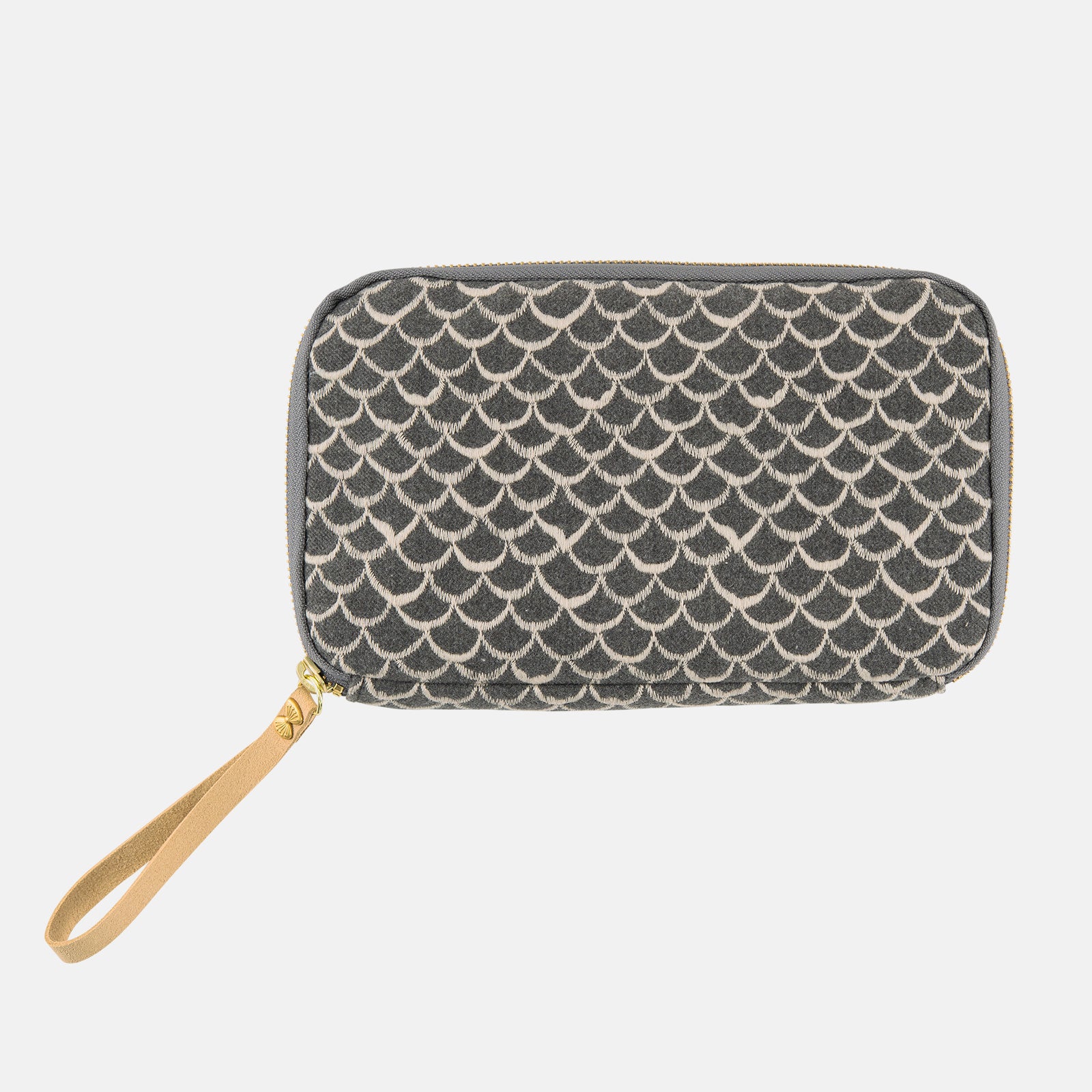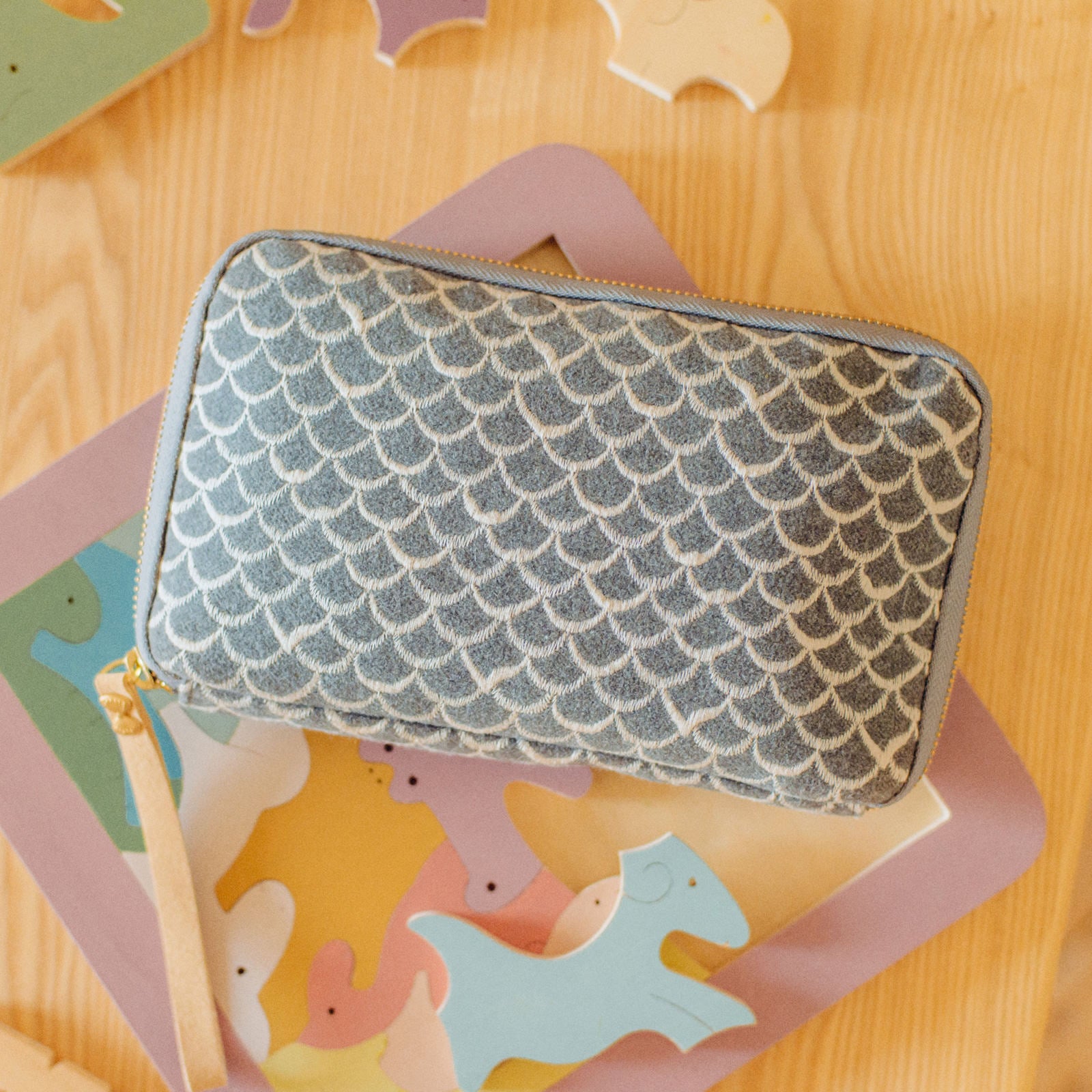 minä perhonen creates custom textiles that are specially dyed, embroidered and woven to recreate hand-drawn designs. This pouch is named after the textile it is made with, called “mermaid.” The pattern, resembling the small arc of fish scales, is carefully embroidered in waves across the material.