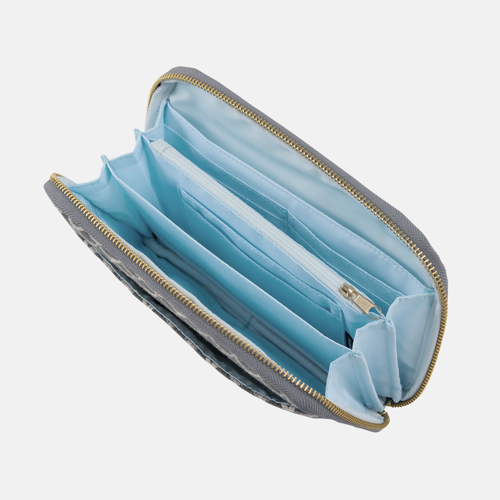 The pouch interior is a calm shade of blue, and the zipper pull contains a looped strap decorated with a butterfly charm.