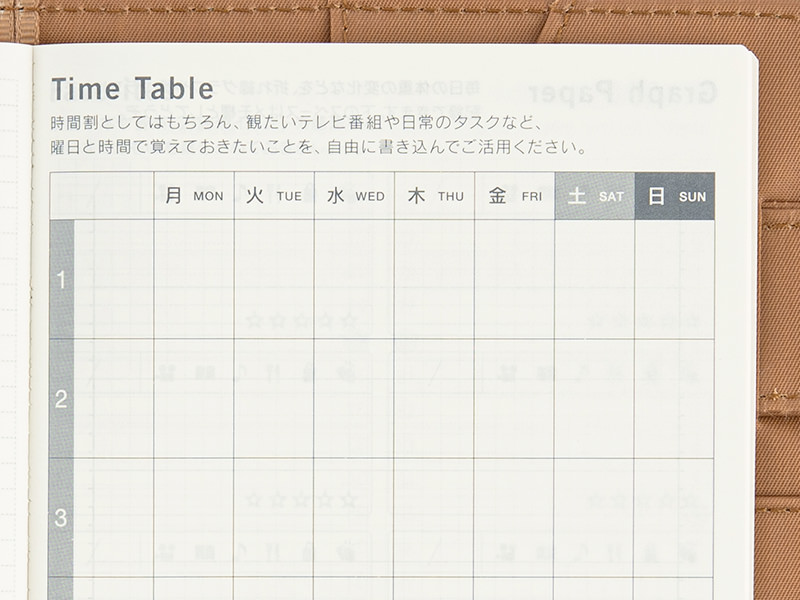 The Original Size book includes one timetable and the Cousin Size book includes two timetables for writing in a recurring hourly schedule for each day of the week. These are useful for things like filling in the broadcast times of favorite television shows or splitting up house chores.