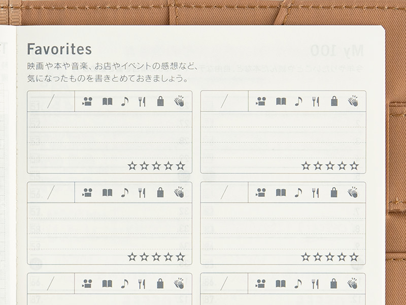 The Favorites page is a great place to list rankings for movies, books, music, restaurants, plays, games and much more — on a sliding scale of 5 stars. The Original Size contains space for 10 entries while the Cousin Size contains space for 12 entries.