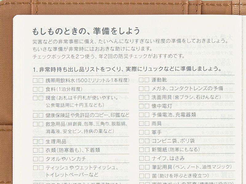 This page contains a checklist of items to have ready in case of an emergency. There is also a space to list nearby evacuation zones (common in Japan), emergency contact information and topics discussed between family and friends.