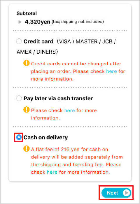 This payment method is only available for orders placed within Japan. An additional handling fee of 220 yen will be added to the order. Cash only.