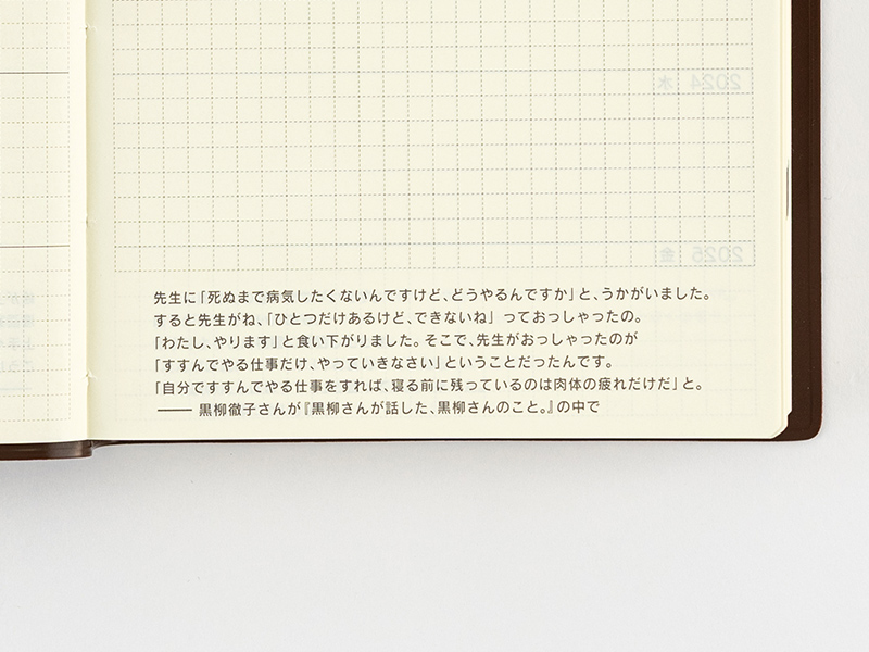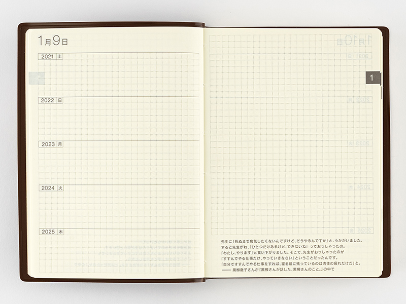 The Japanese daily quotes on the bottom of the page are excerpts from Hobo Nikkan Itoi Shinbun articles from the past 10 years. The quotes in the 2020 and 2021 edition 5-Year Techo books are the same.