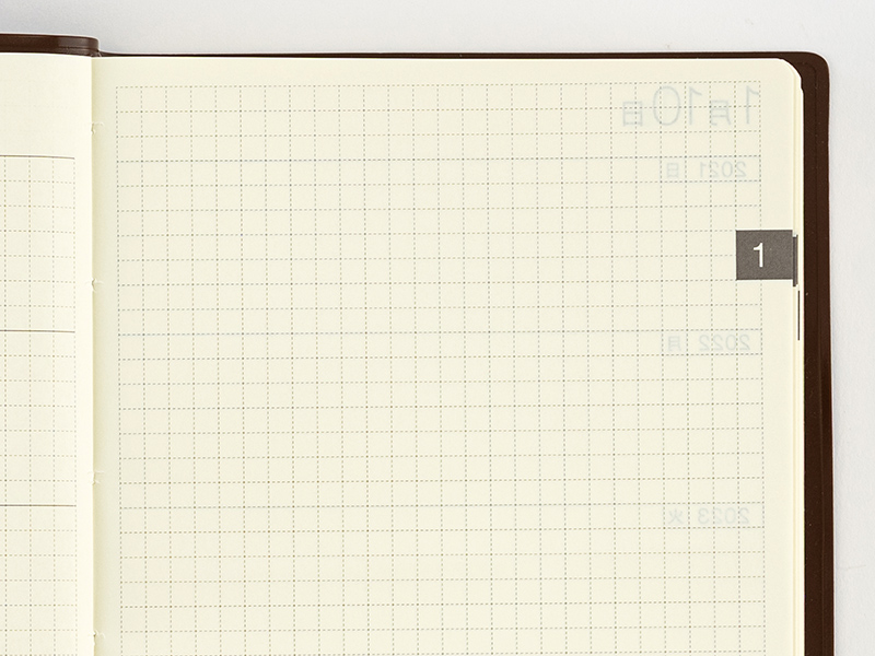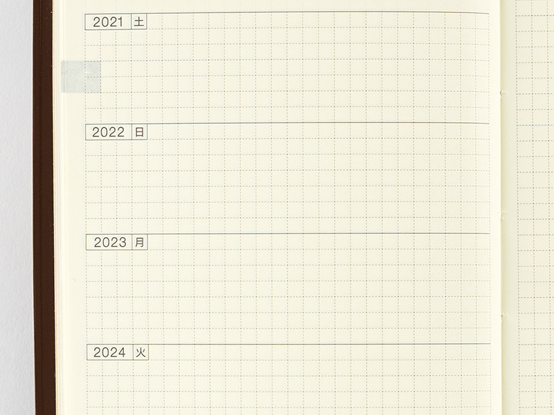 The basic format of the 5-Year Techo has the same date across five years listed on the left side, and a blank graph paper memo page on the right. The layout is flexible enough to allow users to either fill in their pages the same way every day or mix things up as they go.