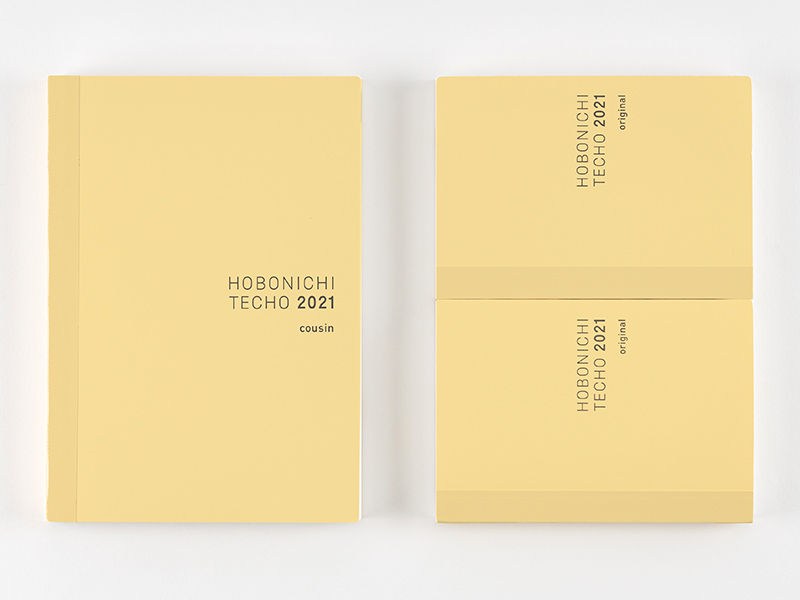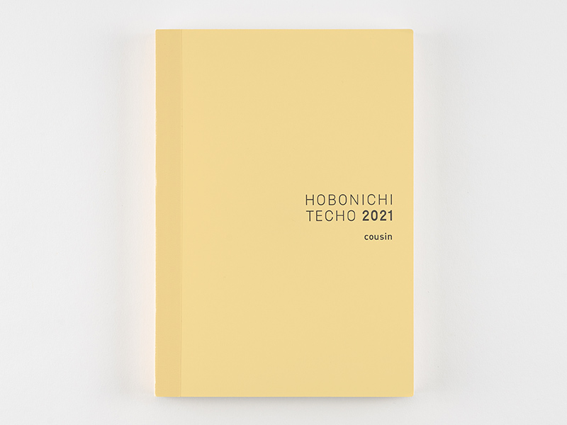 The front of the planner book is made of strong card stock with a soft ivory hue, and includes the label “HOBONICHI TECHO 2021 cousin” printed in gray letters. The April-start version also lists the label “spring.”