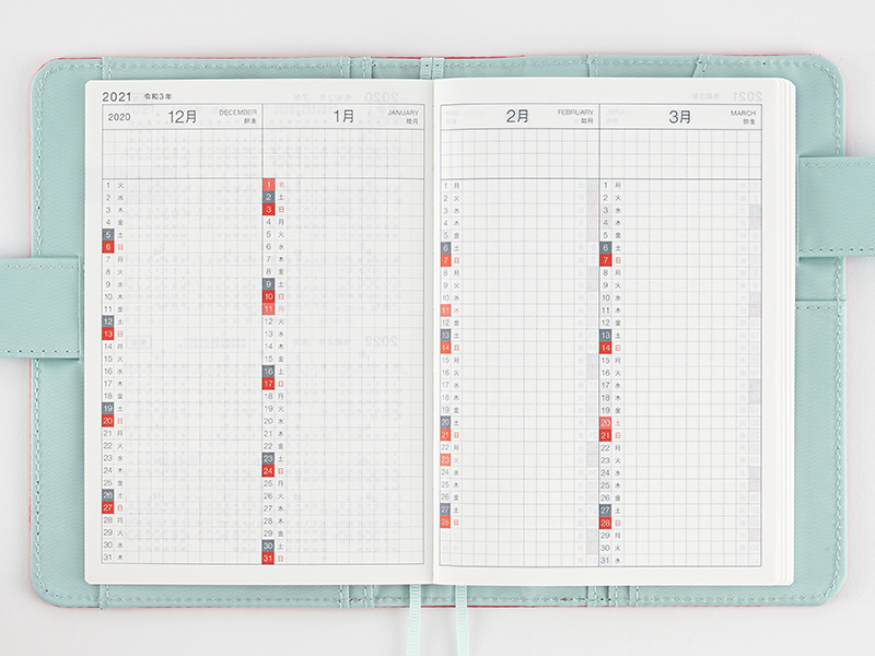 The yearly index covers 4 months per page for a total of 16 months, allowing users to track long-term plans and information (the A5 Cousin size covers 6 months per 2 page spread for a total for 12 months). The top of each monthly column includes 4 lines of space for recording any kind of information, such as that month’s goals or commitments, or drawing in checkboxes for a to-do list.