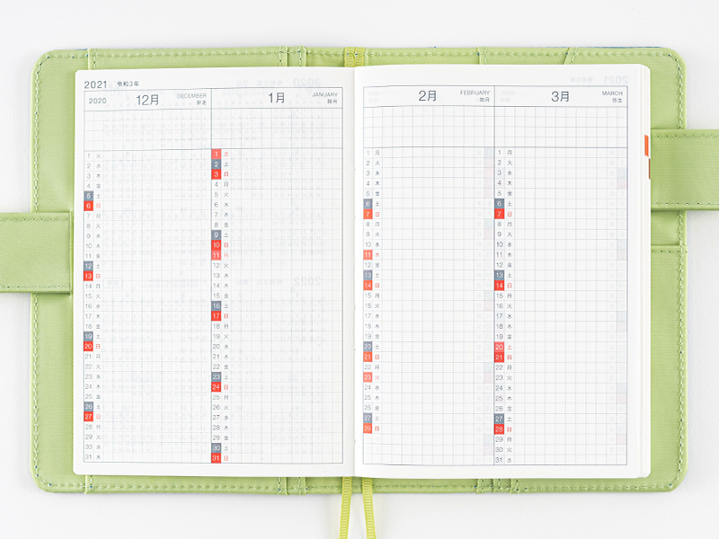With 2 months per page, there are 8 pages covering the 16 months from December 2020 to March 2022. The top of each monthly column includes 4 lines of space for recording things like that month’s goals or commitments, or drawing in checkboxes for a to-do list.