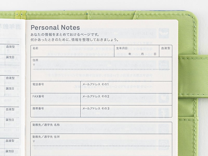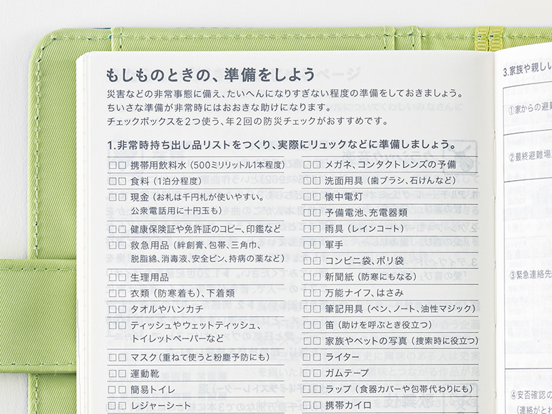 This page contains a checklist of items to have ready in case of an emergency. There is also a space to list nearby evacuation zones (common in Japan), emergency contact information and topics discussed between family and friends.