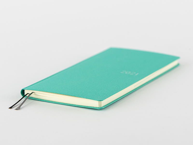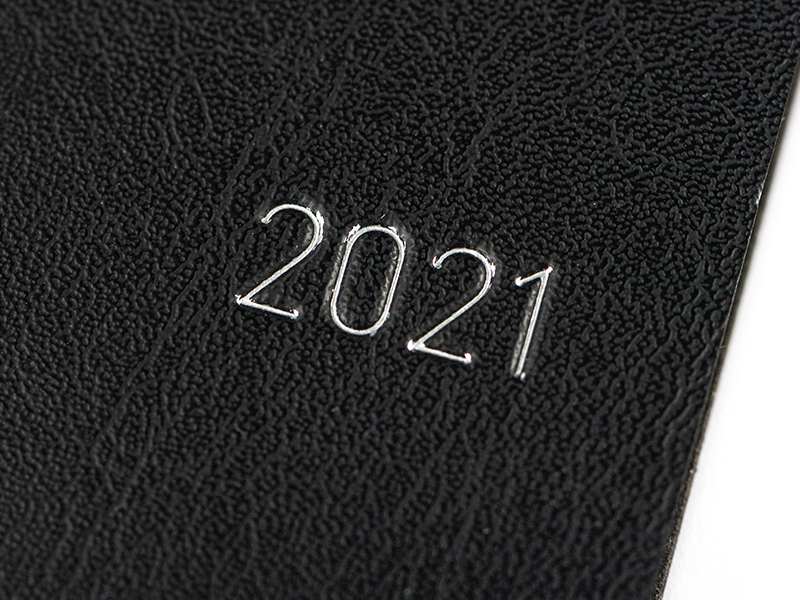 The spine of the Weeks book is embossed with “2021” for easy reference when storing the planner in a bookshelf.
